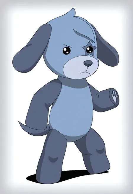 plushie, living plushie, blue dog, male, chibi, black eyes, floppy ears, solo, full body.