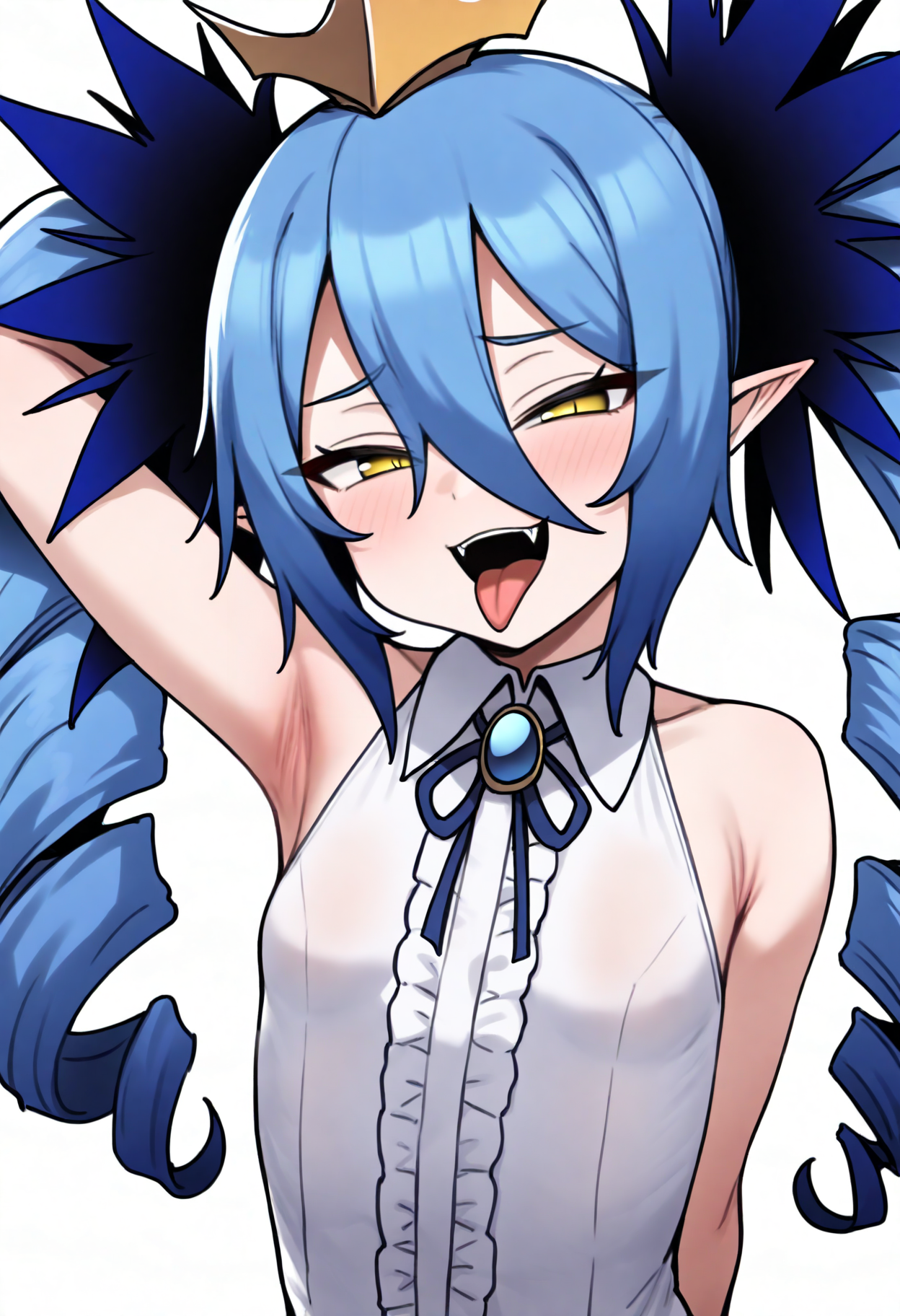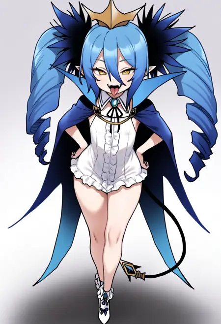 基本的なプロンプト:1girl, lewisia, blue hair, drill hair, bangs, hair between eyes, long hair, twin drills, twintails, yellow eyes, pointy ears, fangs, crown