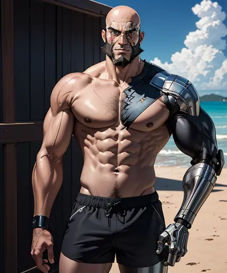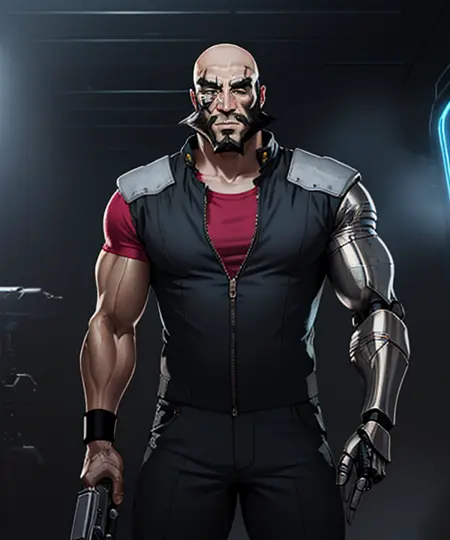 외모 힌트: male_focus, 1boy, facial_hair, beard, bald, black_hair, muscular, eye_scar, metal_eyepeice, cyborg, prosthetic_arm, single_metal_arm,