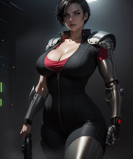 복장 힌트: armor, jumpsuit, single_red_sleeve, black_wristbands, armored_boots,