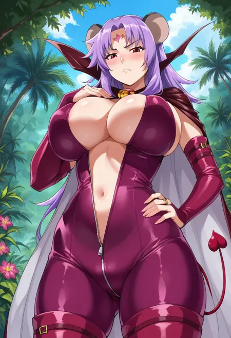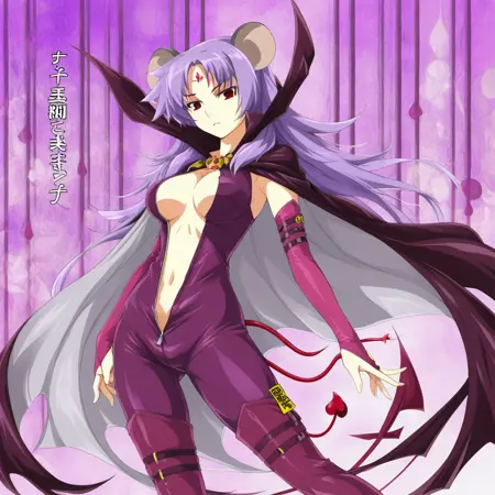 red eyes, purple hair, long hair, mouse ears, forehead jewel, forehead mark, demon tail,