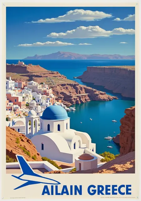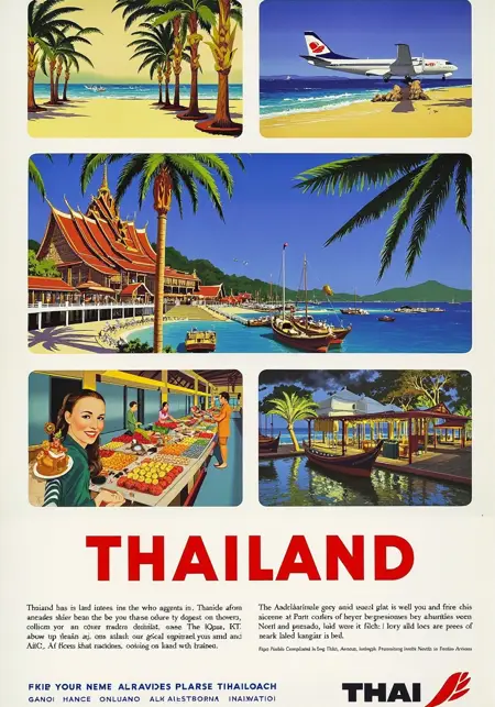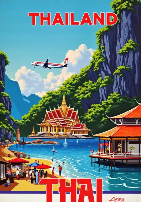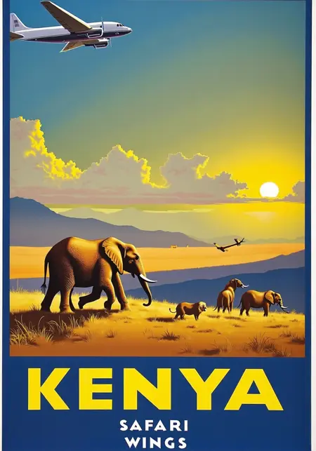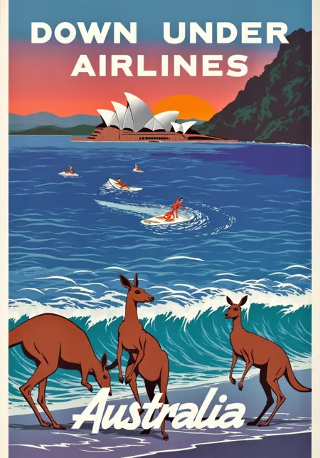 미국의 항공 여행 포스터는 낙관주의, 고급스러움, 모험의 분위기를 풍겼다. 밝고 넓은 하늘을 날아가는 세련된 비행기를 묘사한 이 포스터들은 속도와 현대성을 강조하기 위해 원색의 강렬한 색상과 단순화된 디자인을 자주 사용했다. 세련된 복장을 한 매력적인 승객들이 탑승하거나 비행의 편안함을 즐기는 장면을 보여주며, 항공 여행을 전후 시대의 번영과 진보의 상징으로 표현했다. 강조된 목적지는 이국적이고 흥미로운 곳으로, 대표적인 랜드마크와 풍경을 담아 전 세계 탐험과 편리하며 고급스러운 새로운 시대의 여행에 대한 꿈같은 약속을 전했다.