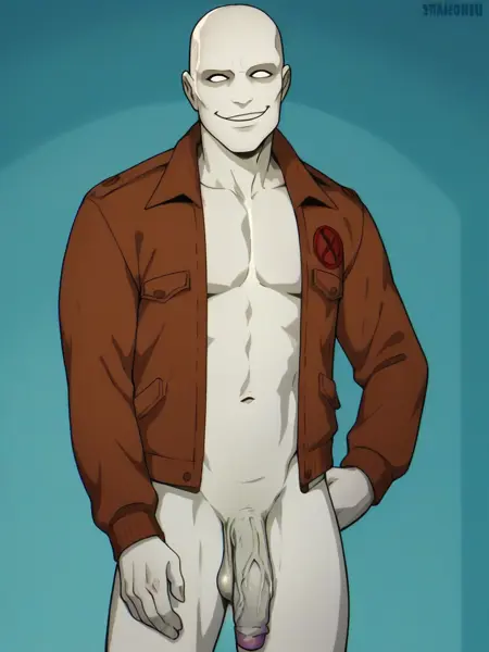 프롬프트: Morph_X97, 대머리, 완전히 흰 눈, 회색 피부, 열린 재킷, X-Men 복장