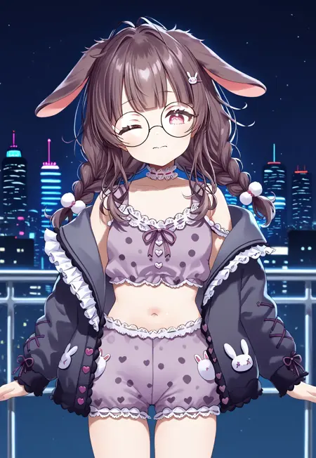 + Shondo3rd,长发,发饰,刘海,粉色眼睛,动物耳朵,眼镜,棕色头发,兔耳,兔子发饰,辫子,圆框眼镜,双辫,发夹,