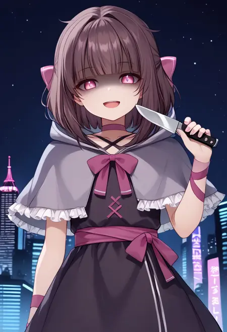 + Shondo2ndB,粉色眼睛,刘海,蝴蝶结,棕色头发,侧发,低双马尾,发带,x 发饰,长发,中长发,