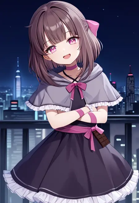 + 荷叶边连衣裙,黑色蝴蝶结,项圈,灰色小披肩,披肩,粉色丝带,黑色腰带,长袖,巧克力,食物主题服装,