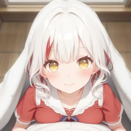 Trigger words: xiaozhi, red hair, queen, forehead_jewel, 1girl, bangs, white hair, lace-trimmed_gloves, shawl, yellow eyes