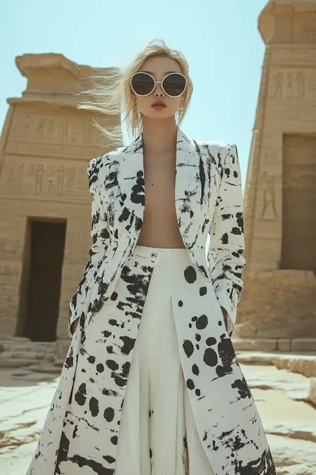 권장 키워드: Wear it in style, a woman stands in front of an ancient temple. She is dressed in a black dress