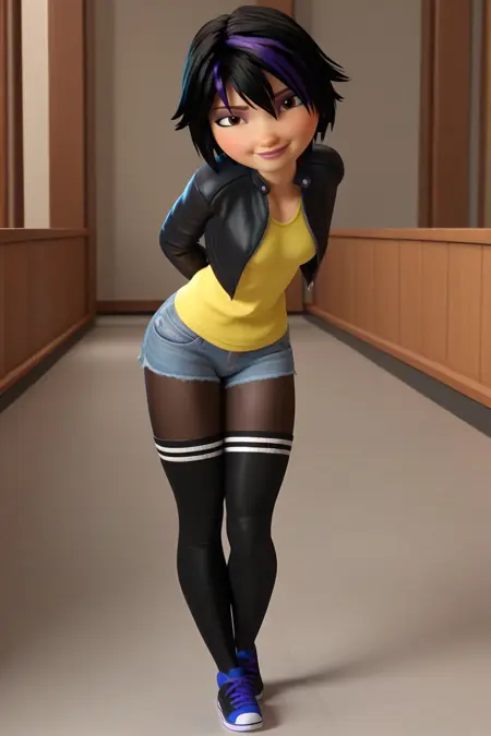 black leather jacket, black leggings, denim short shorts, yellow t-shirt, cropped jacket, open jacket, white thighband, black sneakers