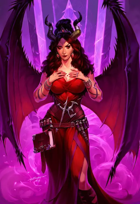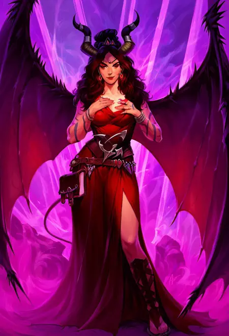 AreeluVorlesh,1girl,solo,wings,black hair,large breast,horns,demon girl,jewelry,tail,long hair,earrings,fingernails,demon wings,makeup,lipstick,bracelet,ring,hair ornament,dress,red dress,red eyes,sandal,brown hair,curly hair,tattoos,demon horns,belt,book,