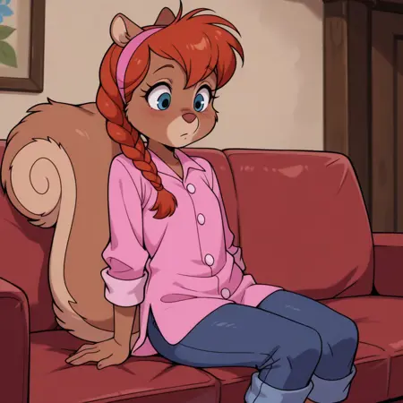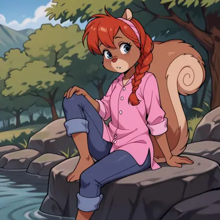 tammysqrrlIL, semi-anthro, female, squirrel, brown fur, red hair, braided ponytail, blue eyes, blue jeans, pink button-down shirt, pink headband