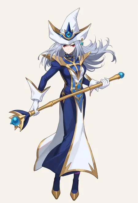 1girl, solo, SilentMagicianOG, 长发, 银发, 侧分刘海, 红眼, 中等胸部, SiMaClassic, 白蓝配色镶银边的短袍, 极长连衣裙, 蓝色连衣裙, 白色手套, 蓬松袖子, 白蓝配色帽子, 魔法帽, 金属项圈