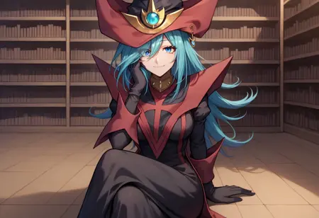 1girl, solo, SilentMagicianOG, 长发, 青绿色头发, 侧分刘海, 蓝眼, 中等胸部, SiMaAni, 黑红配色镶红边的短袍, 极长连衣裙, 黑色连衣裙, 黑色手套, 蓬松袖子, 黑红配色帽子, 魔法帽, 金属项圈, 金色项圈