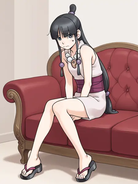 옷: 기모노, 보라색 재킷, 마가타마 목걸이