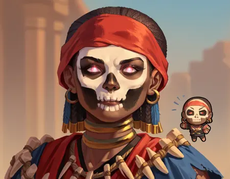 WitchDoctor, dark-skinned female, glowing eyes, skull facepaint, hoop earrings, jewelry,