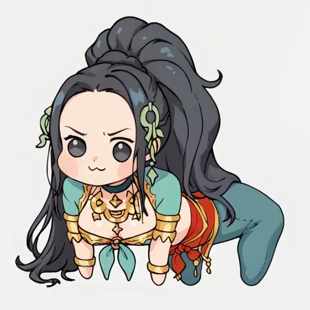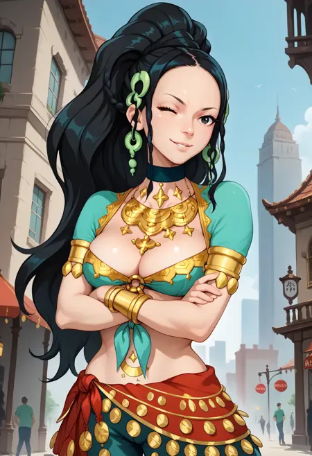 - Default appearance: l0tus, black hair, high ponytail, long hair, hair ornament, black eyes, choker, cyan shirt, crop top, front-tie top, o-ring, cleavage, large breasts, necklace, short sleeves, armlet, gold bracelet, midriff, navel piercing, crescent, red sash, blue pants, sandals, high heels