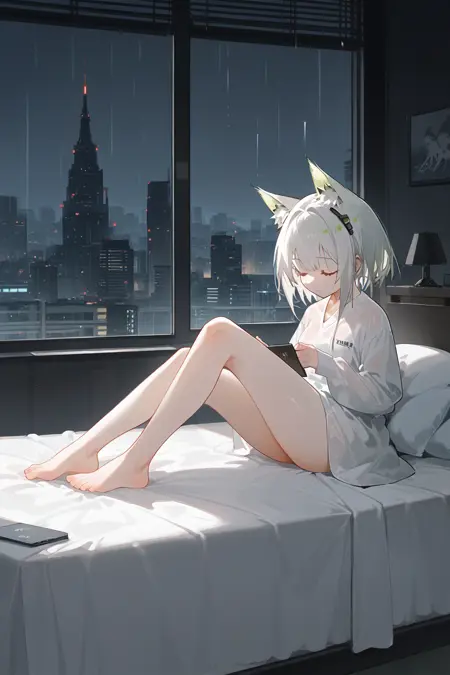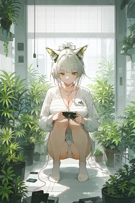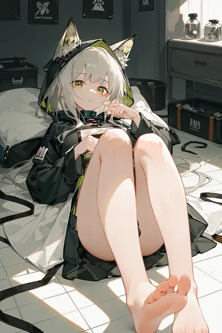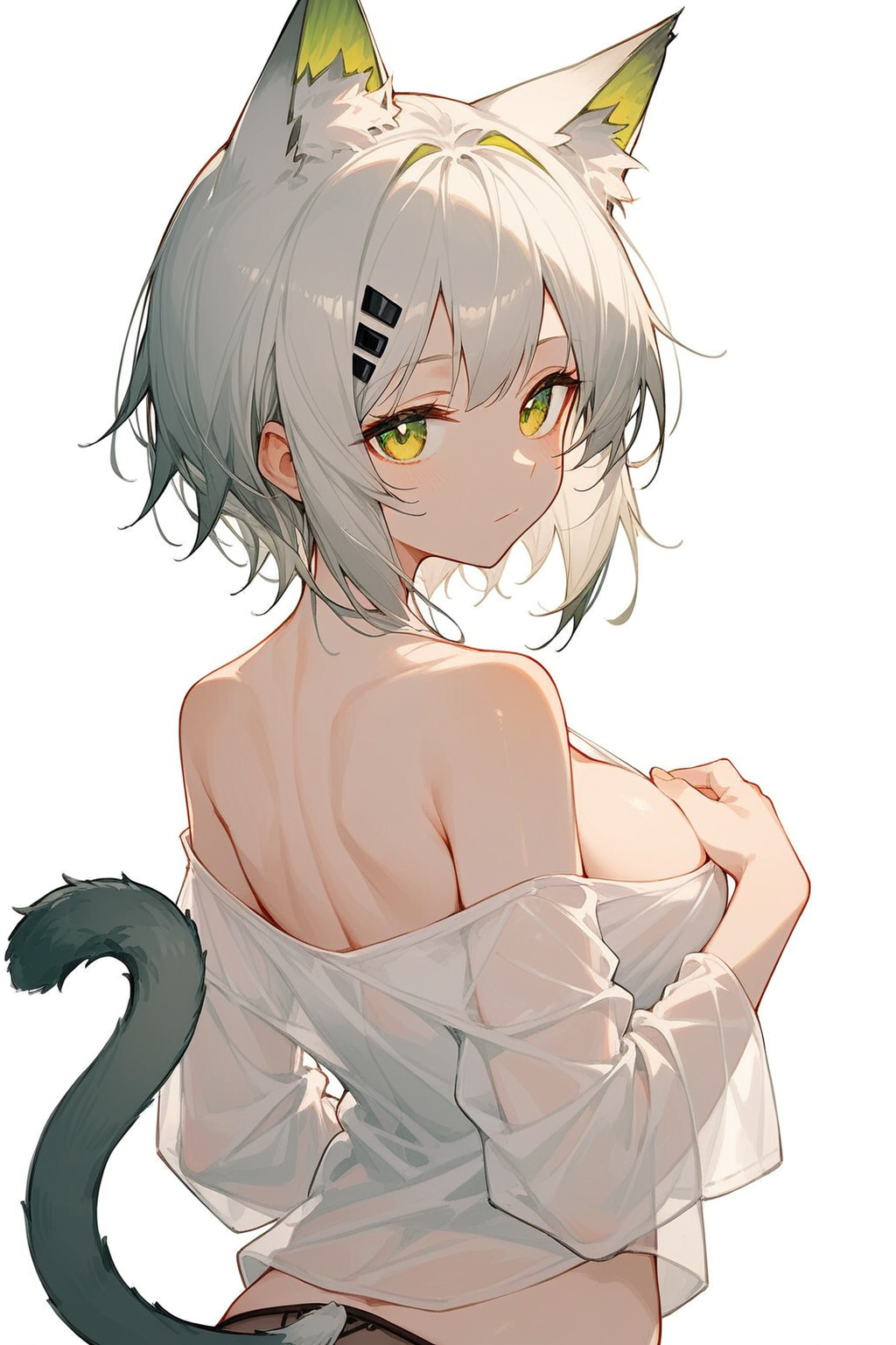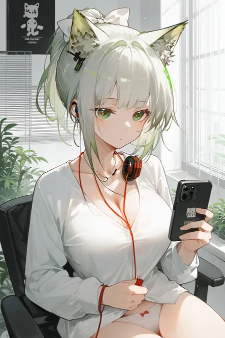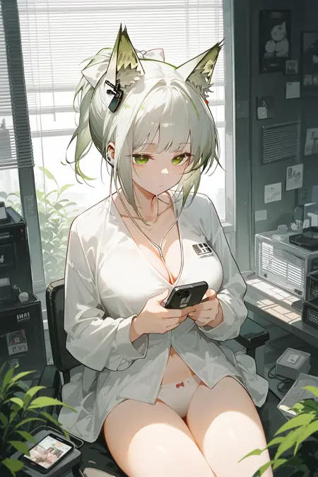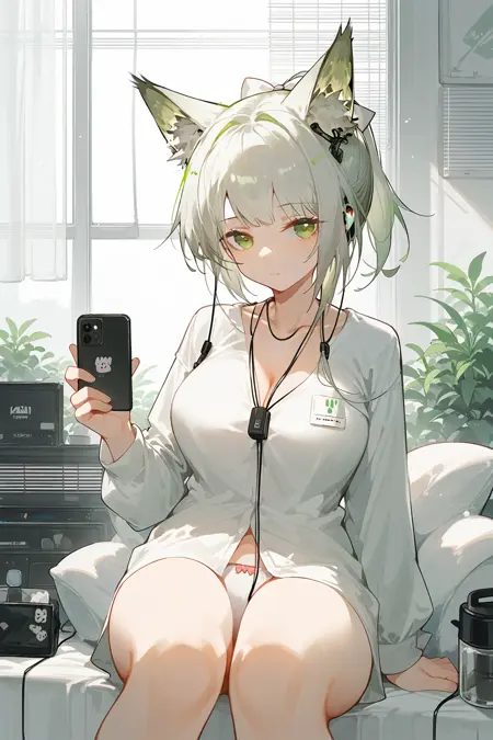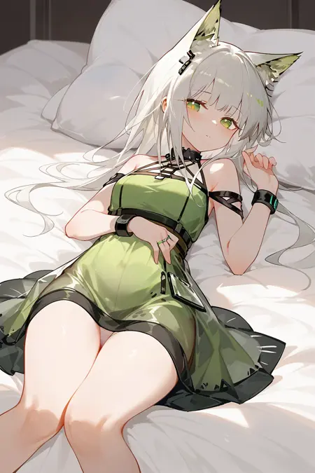 1girl,kal'tsit (arknights),animal ears,green eyes,dress,green dress,wristwatch,animal ear fluff,bare shoulders,white hair,cat ears,bangs,jewelry,ring,long hair,see-through,short dress,
