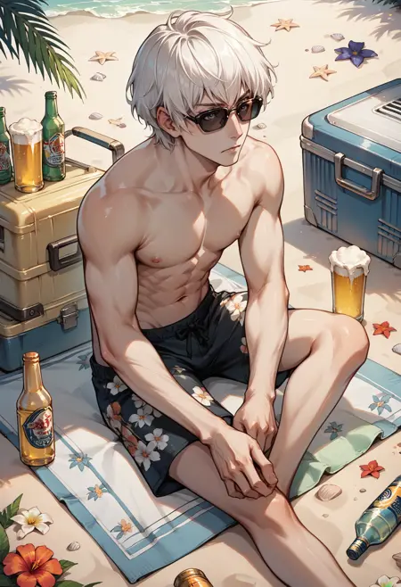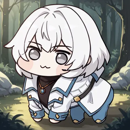 기본 외모: soma, 흰색 머리, 단발, 회색 눈, 흰색 코트, 벌어진 코트, 긴 소매, 검은 터틀넥, 펜던트, 갈색 벨트, 파란 바지