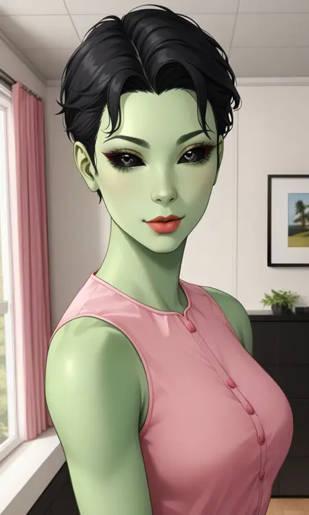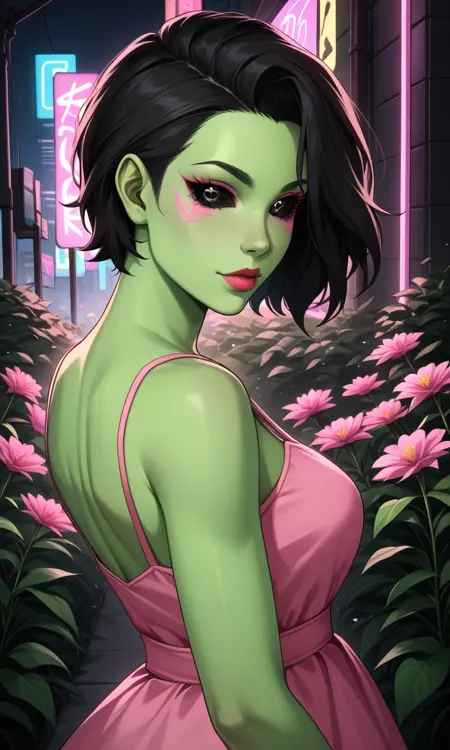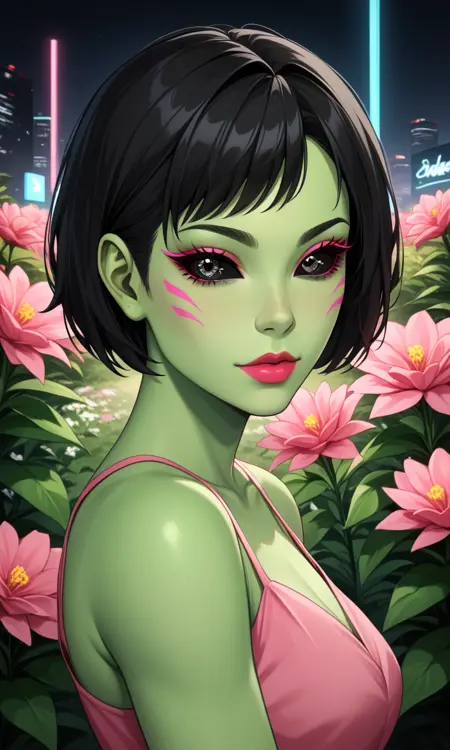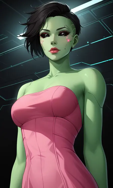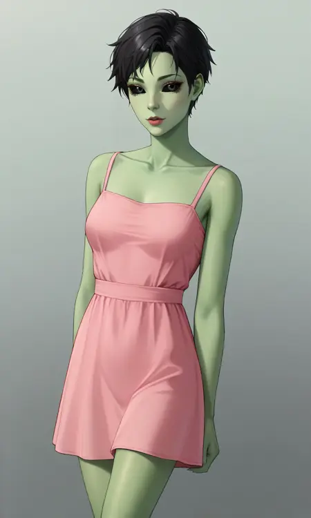 1woman, (green skin), alien, (black eyes), (black sclera), short black hair, pink dress