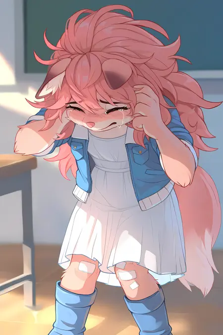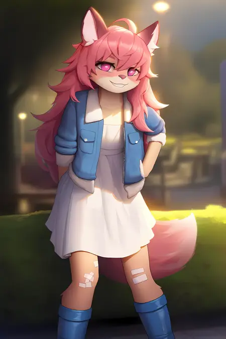 使用 furcasual, furry female, blue jacket, open jacket, white dress, bandaid on knee, blue boots 为她穿上新网络漫画中出现的休闲装扮。