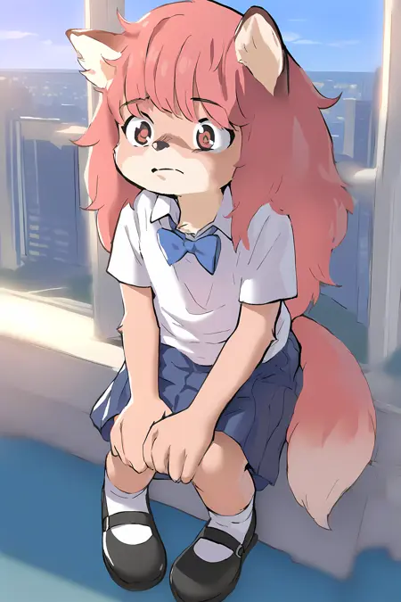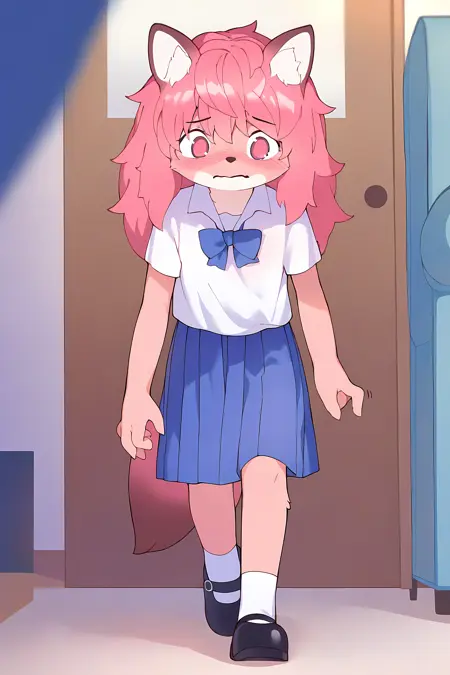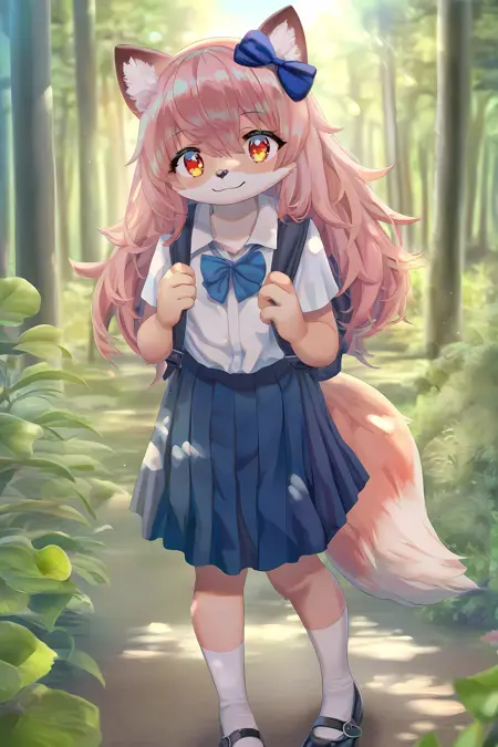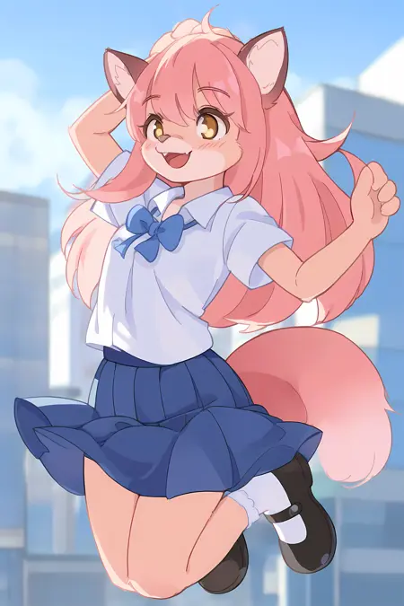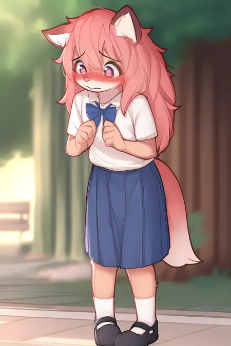 使用 furchan 召唤她,使用 long hair, pink hair, body fur, tail 构建她的外貌,使用 white shirt, blue skirt, bow 召唤她的泰国学生制服。