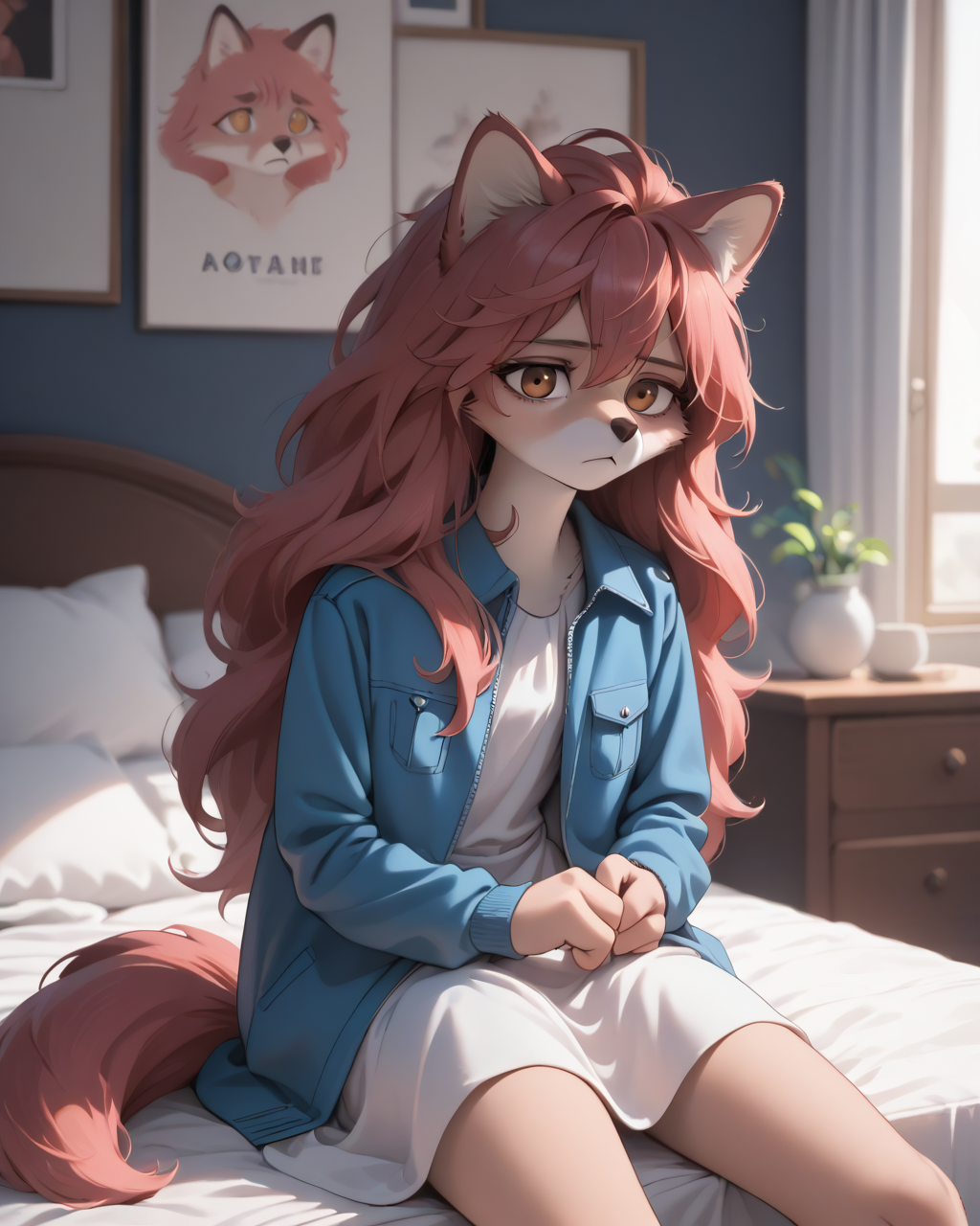 Use furcasual, furry female, blue jacket, open jacket, white dress, bandaid on knee, blue boots to put on her casual dress as seen in new webcomic.