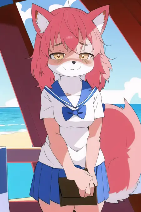 使用 furchan 召唤她,使用 long hair, pink hair, body fur, tail 构建她的外貌,使用 white shirt, blue skirt, bow 召唤她的泰国学生制服。