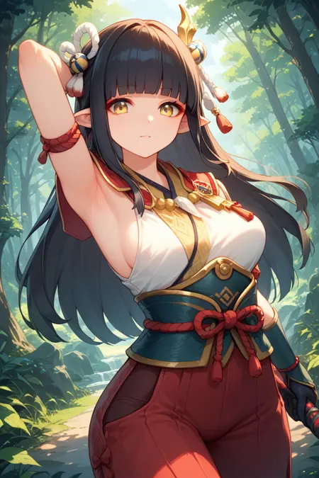 - 1girl, solo, breasts, pointy ears, black hair, long hair, yellow eyes, blunt bangs, hair ornament, long side locks, side locks