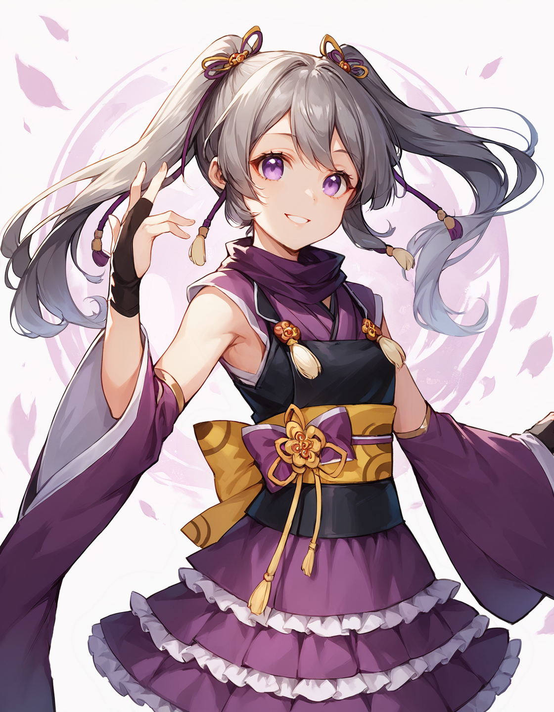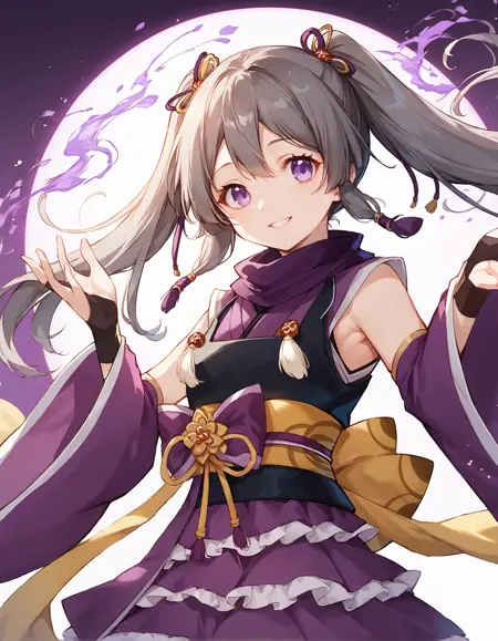 魔法服装: mgrctokimeshizuka,两侧高髻,黄色与紫色发夹,紫色围巾,紫色和服,黑色胸甲,紫色层叠裙摆,白色花边,黄色腰带配紫色蝴蝶结,黑色手套,紫色可拆卸袖子,白色过膝袜