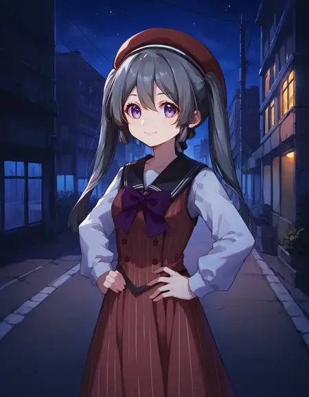 便装: mgrctokimeshizuka,两侧高髻,红色贝雷帽,白色衬衫,黑色水手领,紫色领结,红色条纹背心,红色条纹短裙,黑色丝袜