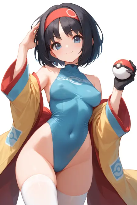 - 改编服装, 过膝袜, 连体紧身衣, 高开叉, 高开叉连体紧身衣, 宽袖, 日式服饰, 白色过膝袜, 长袖, 遮盖肚脐, 手套, 裸露臀部, 遮盖乳头