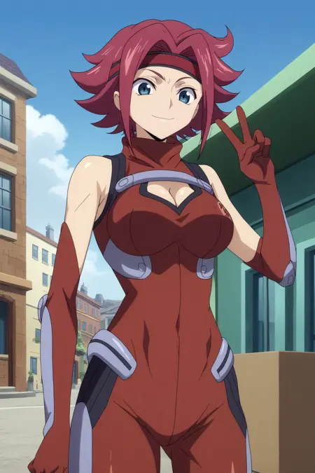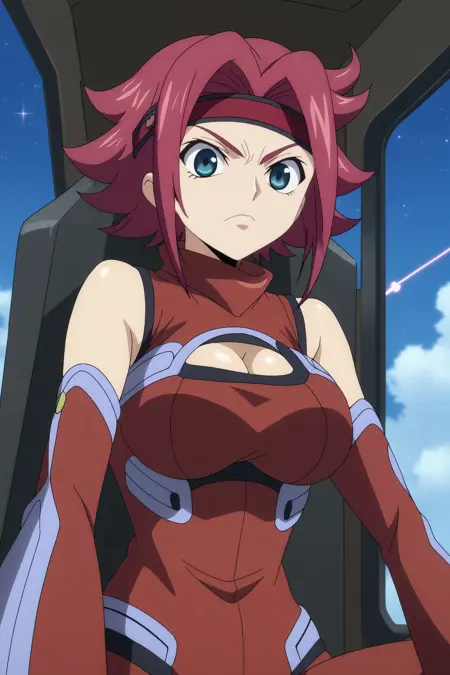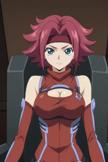 트리거: kallen kozuki,1girl,solo,short hair,sleeveless turtleneck,bare shoulders,large breasts,bodysuit,pilot suit,red bodysuit,cleavage,flipped hair,red headband