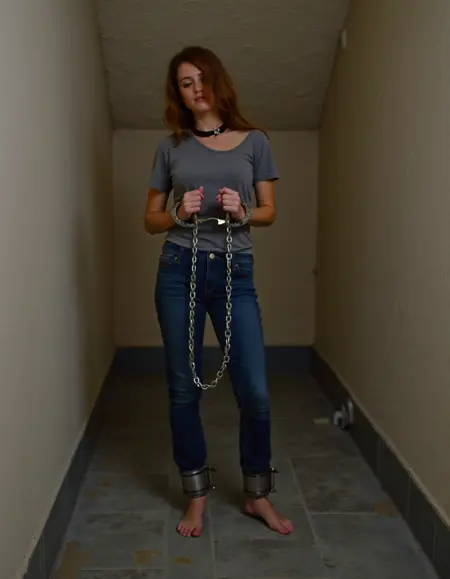 a woman in handcuffs wearing jeans and a tshirt,handcuffs,restrained,realistic,