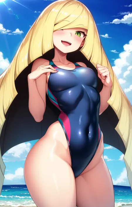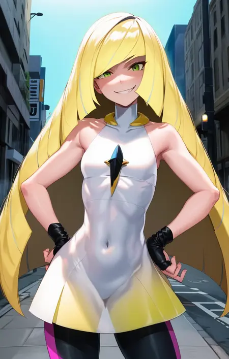 'Lusamine [Pokemon], 1girl, white dress, chest gem, multicolored leggings' 通常のドレス用の例プロンプト。