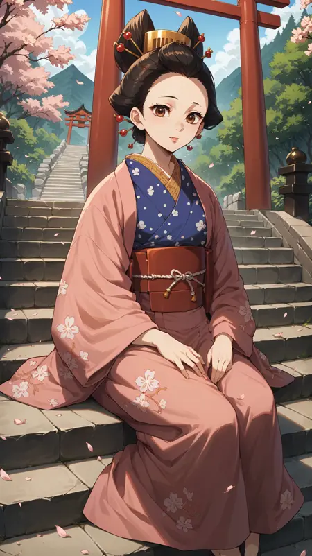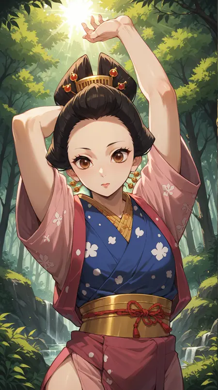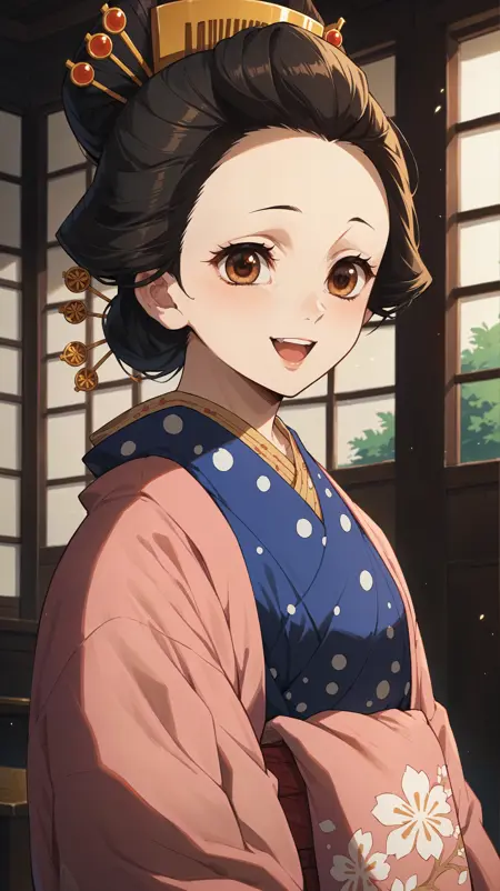 black hair, hair up, brown eyes, gold hair ornament, japanese clothes, pink kimono, blue kimono, forehead,