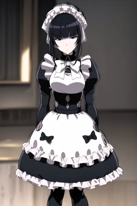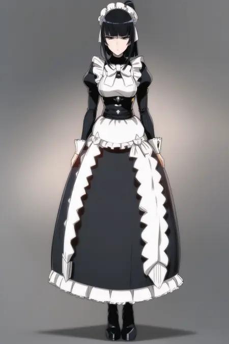 女仆装:maid, black hair, apron, maid headdress, single hair bun, black eyes, maid apron