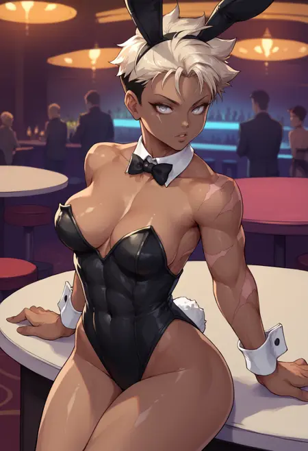 "krissgt, dark-skinned female, eyebrows, grey eyes, very short hair, two-tone hair, scar on arm, scar on leg, large breasts, toned"