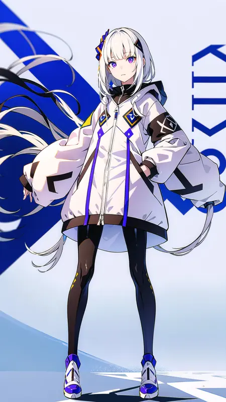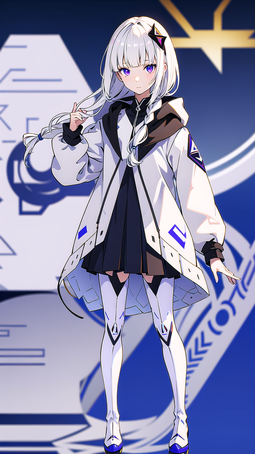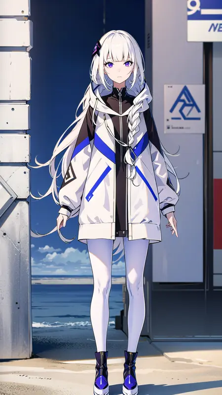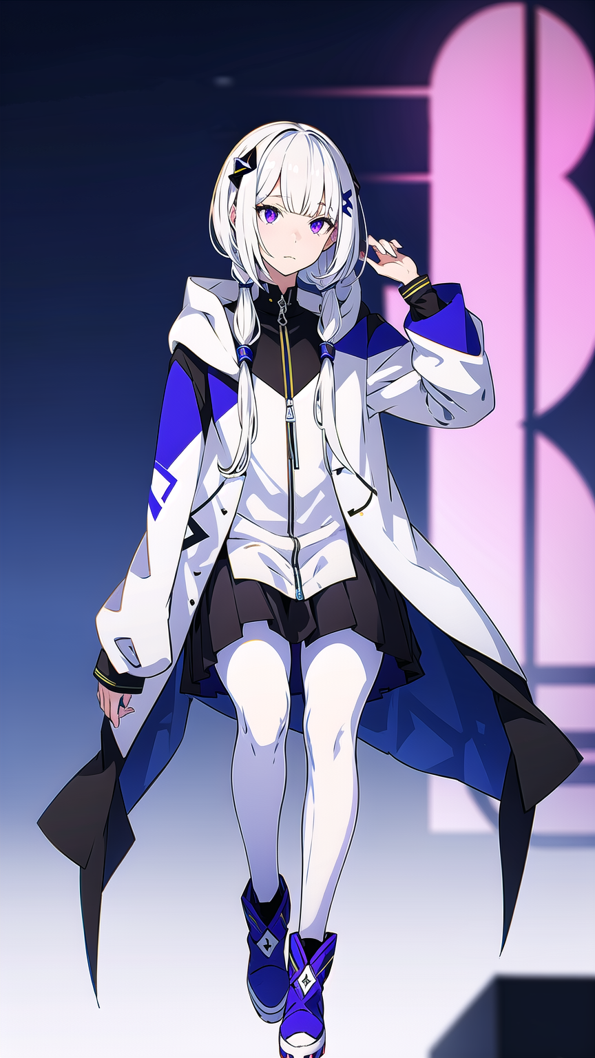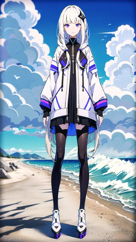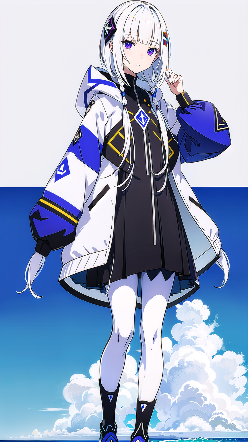 masterpiece, best quality, kafucevio, 1girl, solo, virtual youtuber, white hair, (full body:1.2), purple eyes, hood, white background, blue footwear, hair ornament, bangs, simple background, jacket, slim braid, looking at viewer, long sleeves, boots, standing on beach, blunt bangs, hooded jacket, black dress, high heels, dress, pantyhose, white jacket, closed mouth, hand up, shoes, lora:KafuCevioV1:1, [short hair:0.8],