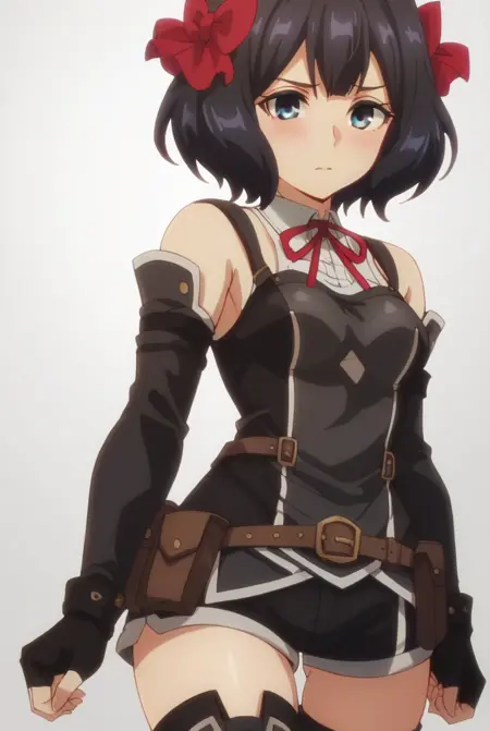 - black thighhighs,fingerless gloves,red ribbon,thighhighs,black gloves,hair bow,belt,detached sleeves,black shorts,belt pouch,black shirt,