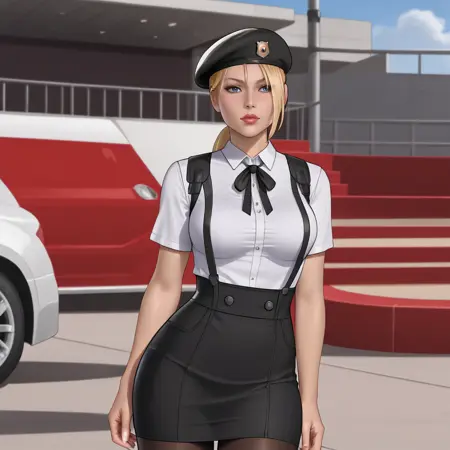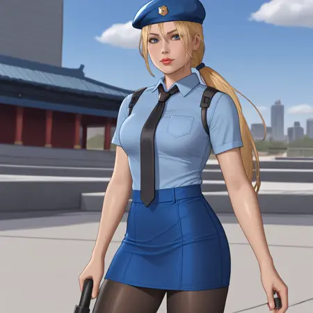 Trigger : SonyaBladeMKDC, 1girl, midriff, navel, crop top, elbow gloves, choker, hat, belt, blonde hair, medium breasts, white shirt, black pants, dark skin, lips, beret, ponytail, dark-skinned female, black headwear, cowboy shot