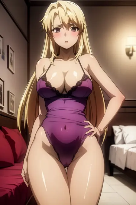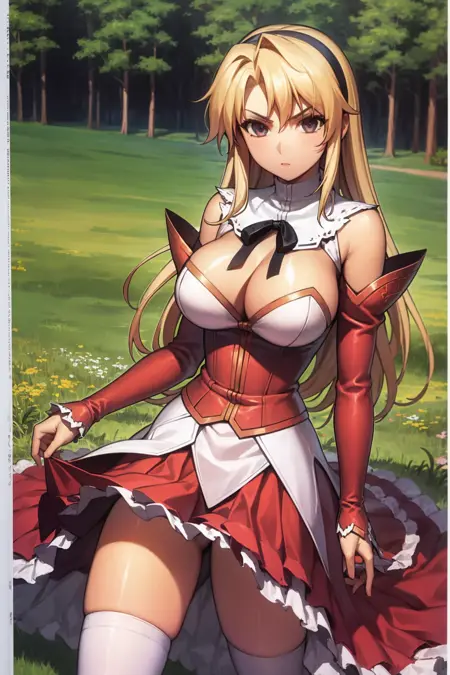 다른 프롬프트: 금발, 긴머리, 파란 눈, 큰 가슴, 절개, 안경, 머리 band, 속옷, 드레스, 갈색 크로스 레이스 신발, 검은 리본, 옷 자르기, 줄리엣 소매, 흰색 허벅지 높이 양말