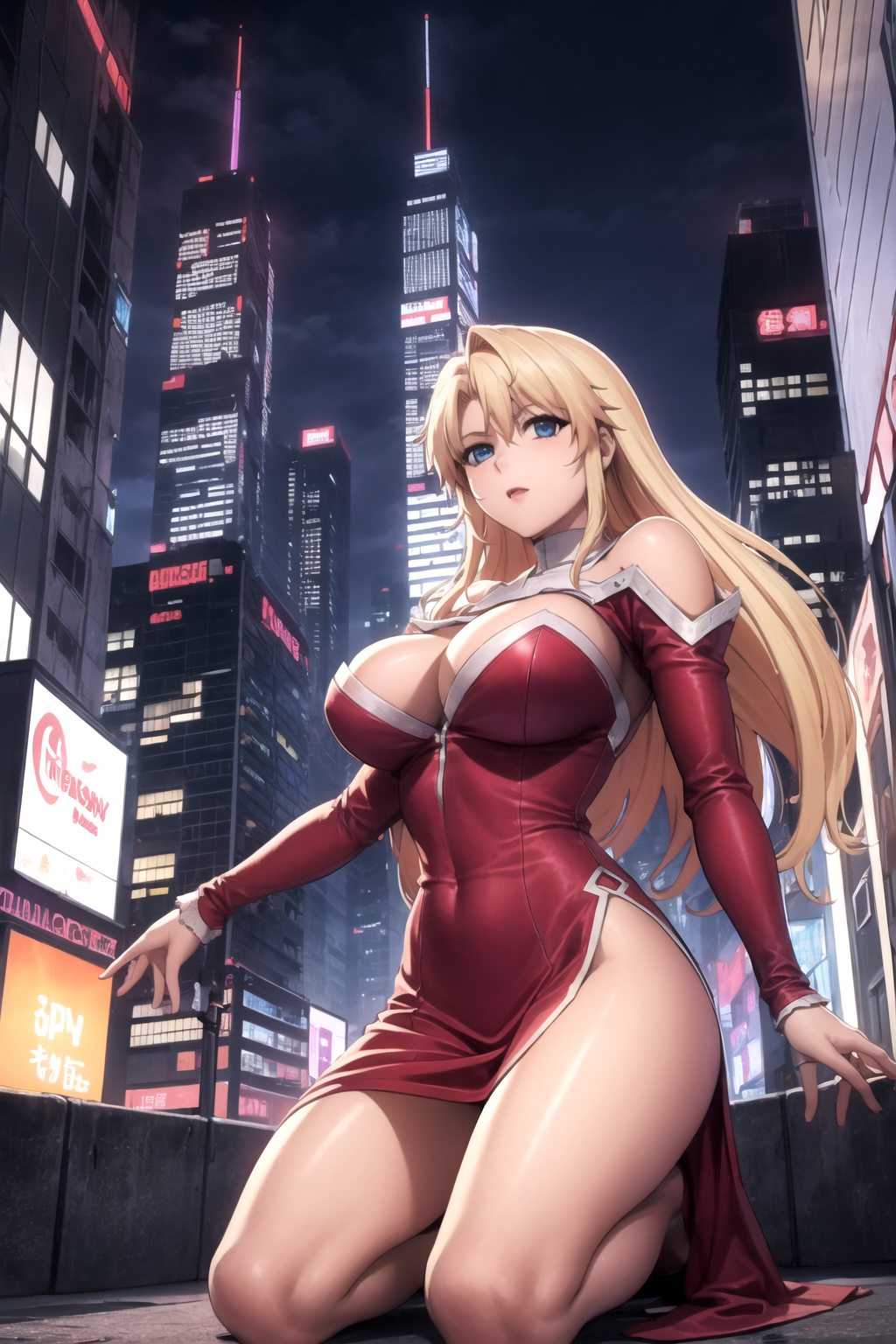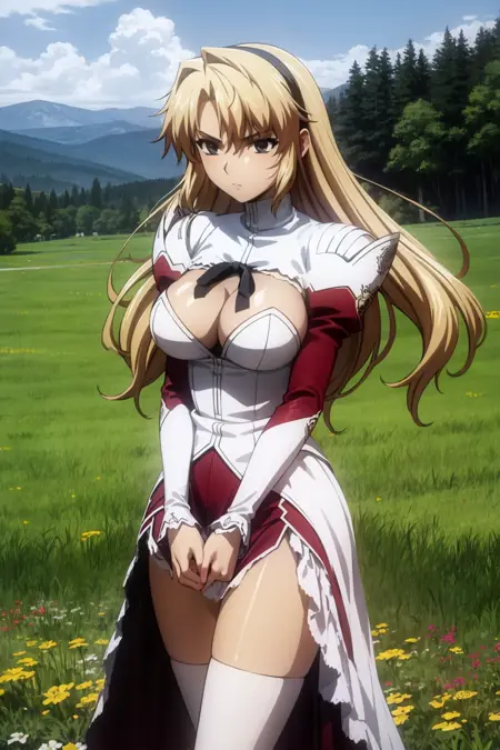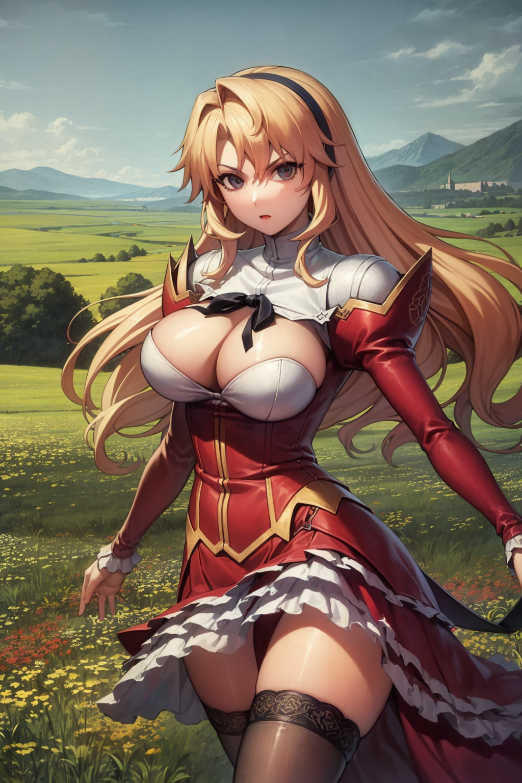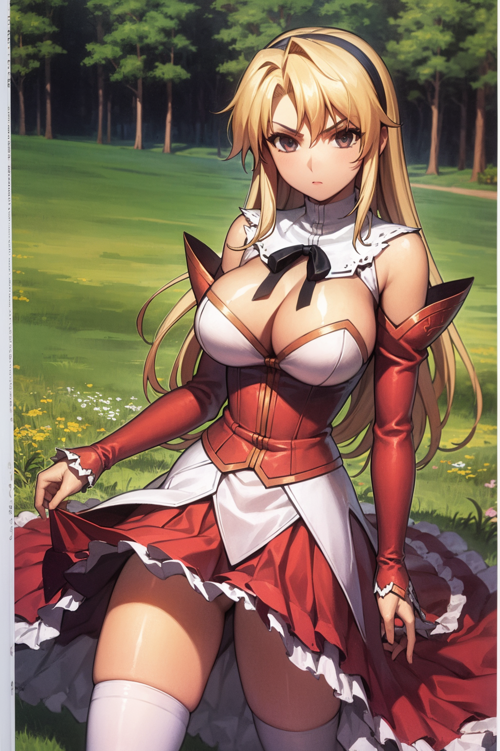 その他のプロンプト:金髪、ロングヘア、青い目、大きな胸、谷間、メガネ、ヘアバンド、インナー、ドレス、茶色のクロスレースの靴、黒いリボン、衣装のカットアウト、ジュリエットスリーブ、白いタイストッキング