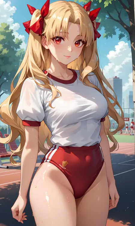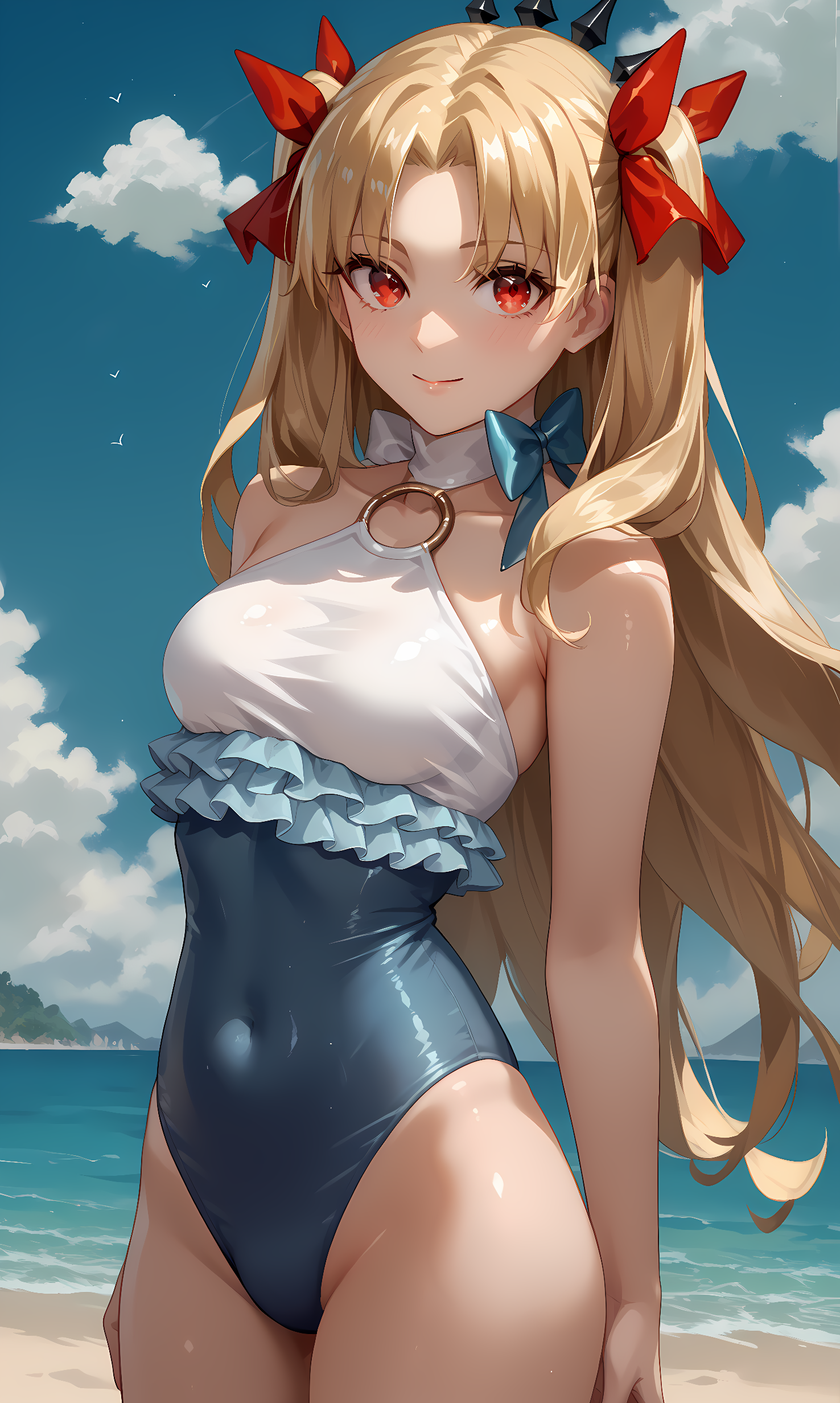 space_ereshkigal_fgo,红色眼睛,金色头发,长发,中分刘海,发带,红色丝带,连体泳衣,双色泳衣,荷叶边,颈间蝴蝶结,水蓝色蝴蝶结,O型环