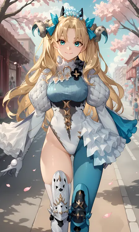 space_ereshkigal_fgo,(水蓝色眼睛:1.3),金色头发,长发,中分刘海,卷曲的角,头饰,发饰,发带,水蓝色丝带