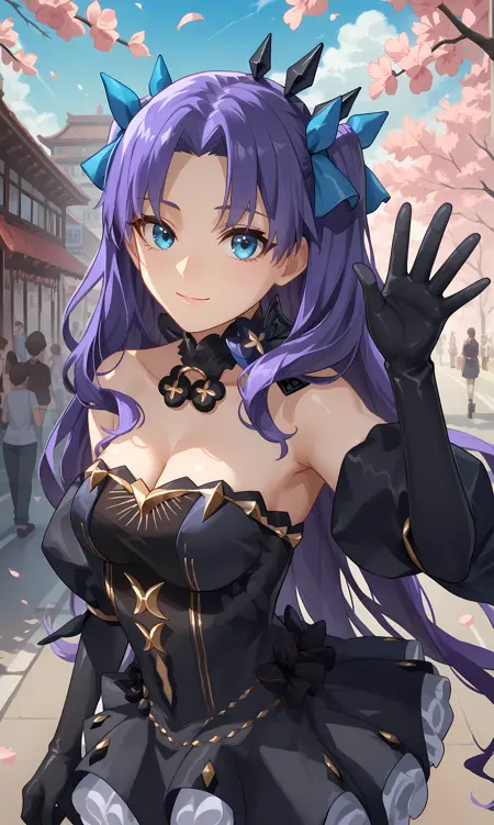 space_ereshkigal_fgo,蓝色眼睛,紫色头发,长发,中分刘海,蓝色丝带,发带,发饰,黑色手套,(肘部手套:1.5),长袖,(蓬松分离式袖子:1.5),黑色连衣裙,无肩带连衣裙,毛皮镶边,荷叶边连衣裙,露胸,裸露肩膀,分离式领子