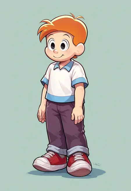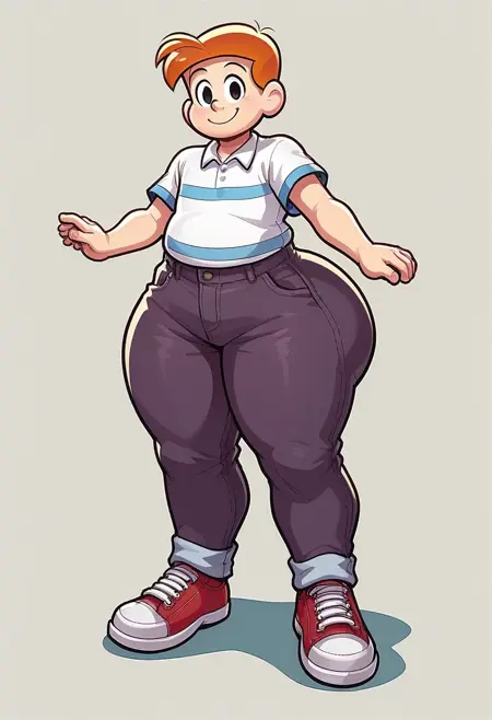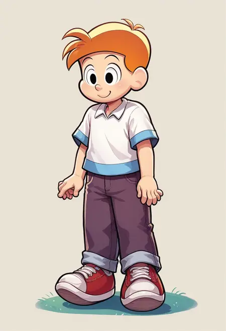 HaroldoTDM, 1boy, black eyes, white short sleeved shirt with blue stripes on the short sleeves and the bottom part of the shirt, purple denim pants, red-and-white sneakers, orange hair, short,