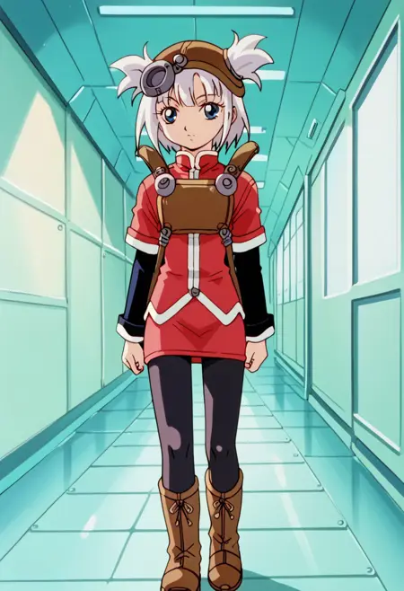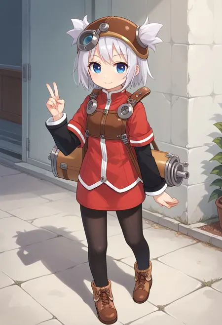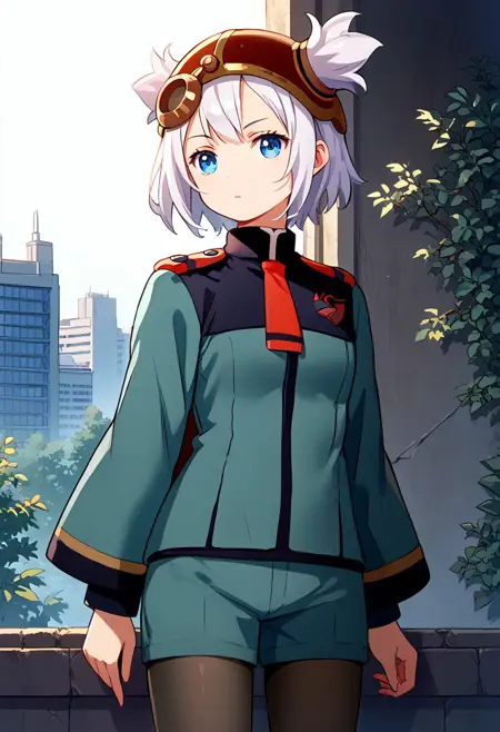 提示词: pratty_scs,白发,头盔,头发从头饰中透出,两侧上扬刘海,鬓发,短发,蓝眼睛,中式立领,红色夹克,胸甲,红色短裙,层叠袖子,短外袖盖住长内袖,袖口,连裤袜,黑色连裤袜,刀鞘,踝靴,棕色鞋履