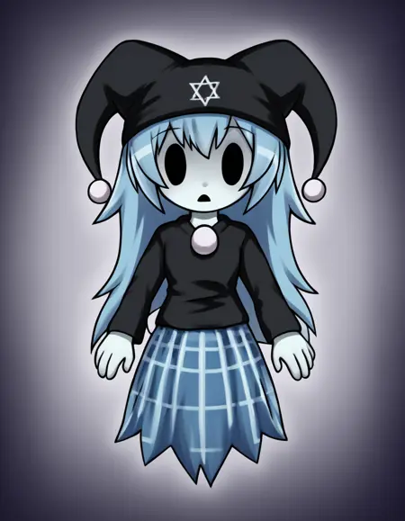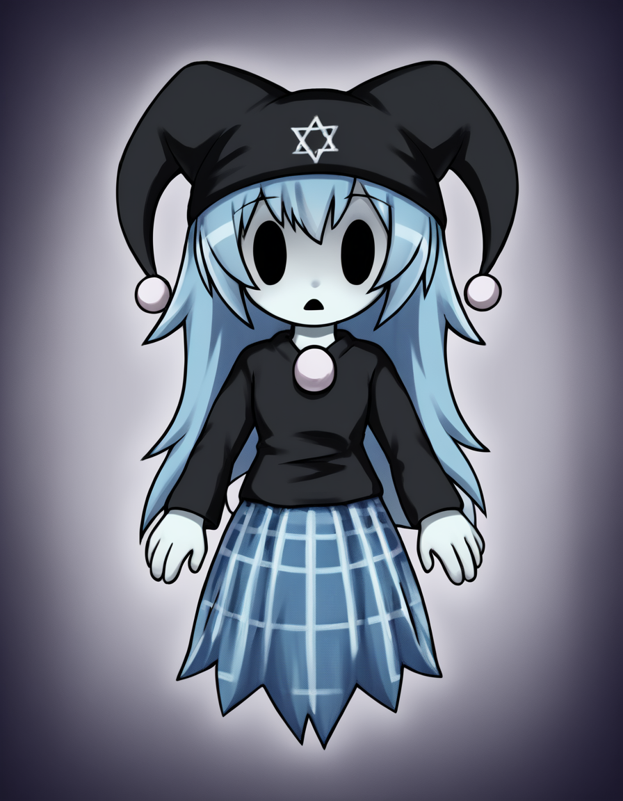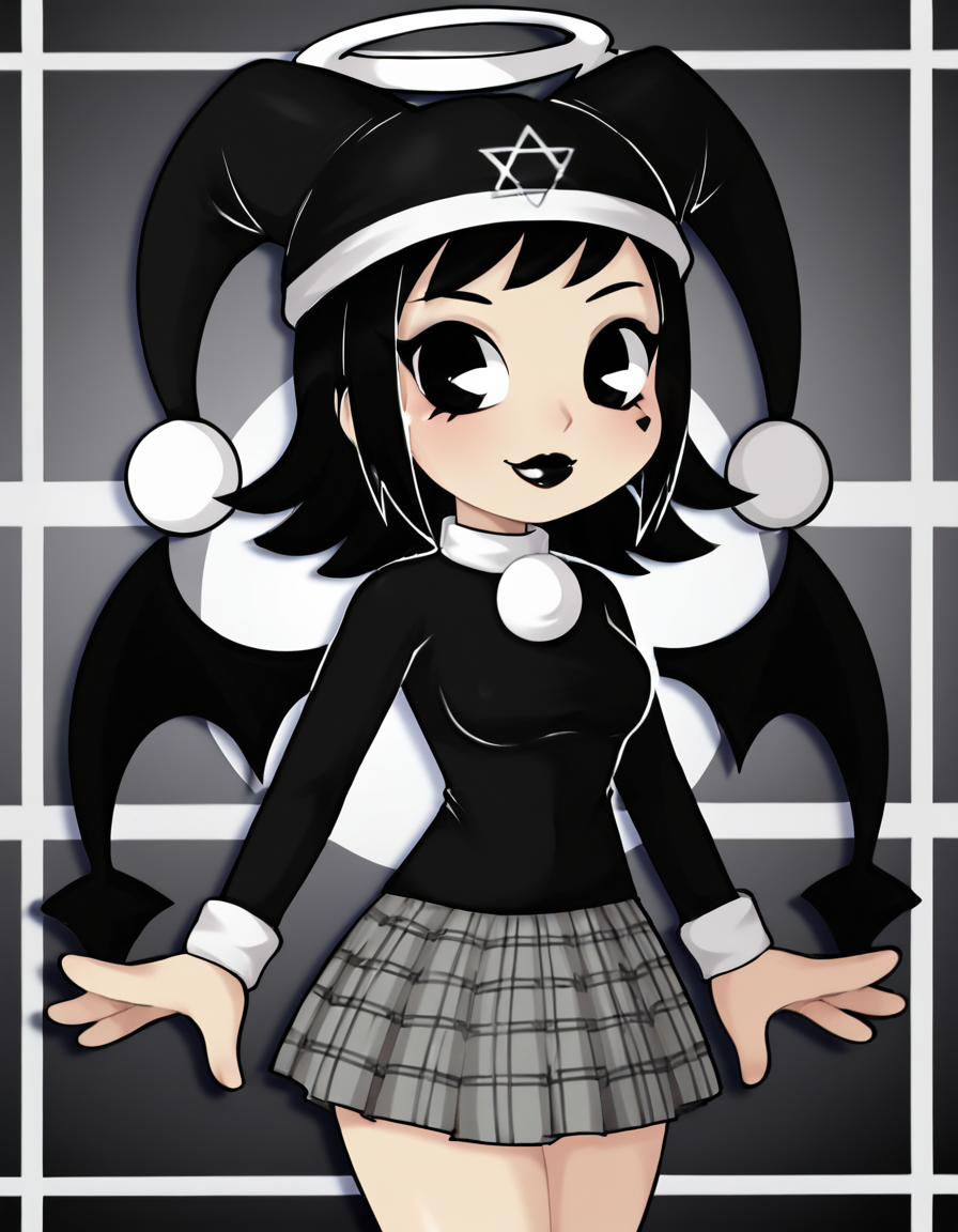 1girl, solo, hat, wings, plaid skirt, hexagram, jester cap, grey hair