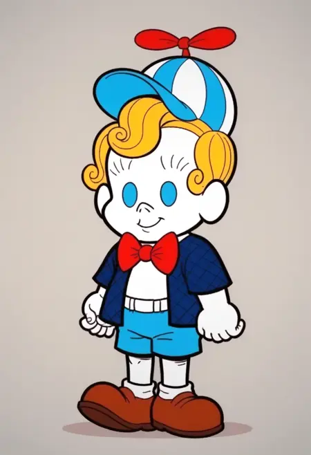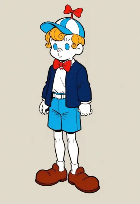 MeninoPorcelanaTDM, 1boy, pale white body, blue eyes, perfectly blonde wavy hair, blue and white propeller cap with a red propeller, light blue shorts, dark blue jacket, red bow tie, brown shoes, white belt, short