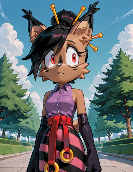 - hair stick bun, red eyes, black collared shirt, sleeveless, armlet, purple elbow gloves, red sash, long striped skirt